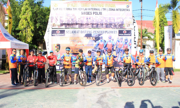 Amuntai - Ribuan peserta dari berbagai komunitas sepeda se-Banua Enam mengikuti gowes bareng dalam rangka memeriahkan HUT Bhayangkara ke-72 dengan tema "Semoga Polri Semakin Jaya". Start dimulai di halaman Polres Hulu Sungai Utara (HSU), dilepas secara simbolis dengan pelepasan balon oleh Bupati HSU H. Abdul Wahid HK dan Kapolres HSU...