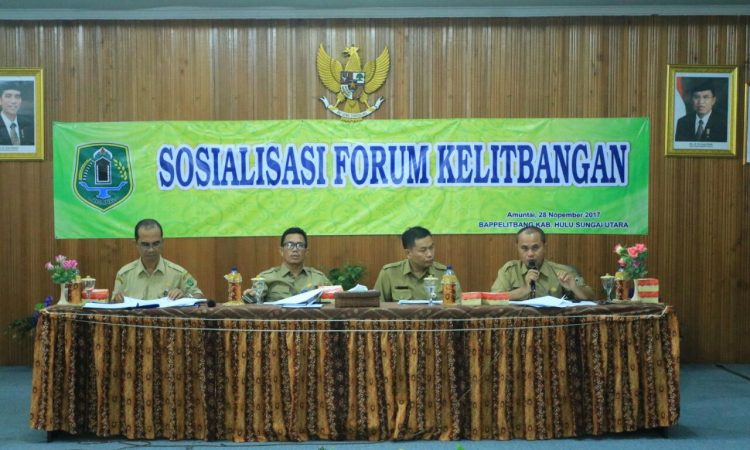 Amuntai - Badan Perencanaan, Penelitian, dan Pembangunan (Bappelitbang) Kabupaten Hulu Sungai Utara (HSU) mengadakan Sosialisasi Forum Kelitbangan, Selasa (28/11). Sosialisasi ini membahas kebijakan pengangkatan fungsional peneliti dan peran litbang dalam perencanaan dan pembangunan daerah, yang dihadiri oleh peneliti Balitbangda Provinsi Kalimantan Selatan Sugiharni, SP, MT, Peneliti Madya Balitbangda Provinsi...
