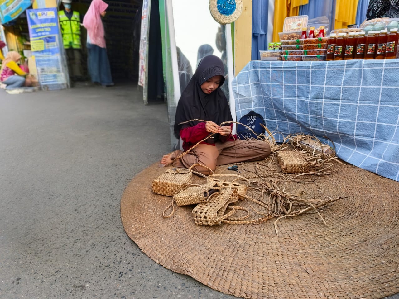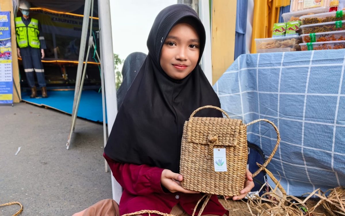 ”Kebanyakan produk yang Ulun buat berupa tas,” ujar Syakira dengan rendah hati saat ditemui sedang asyik menganyam di stand Apindo, Sabtu (25/4/2026).