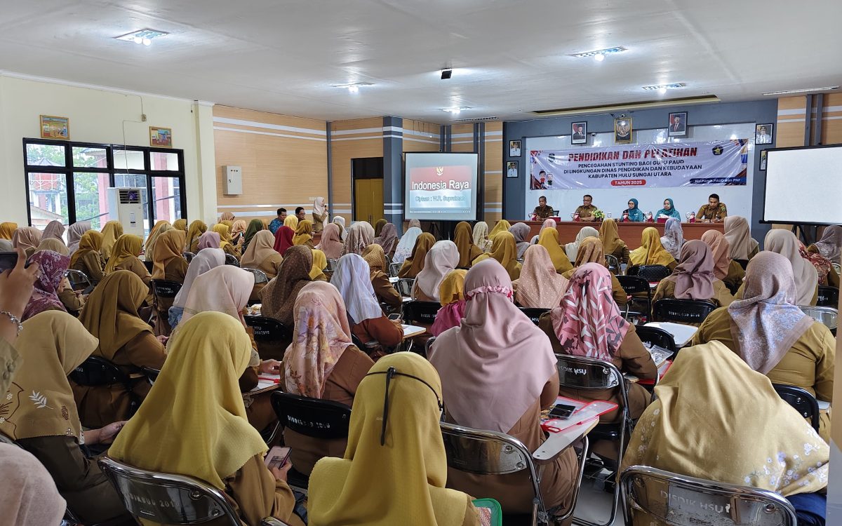 AMUNTAI – Ratusan peserta yang terdiri dari kepala sekolah dan guru Pendidikan Anak Usia Dini (PAUD) se-Kabupaten Hulu Sungai Utara (HSU) mengikuti kegiatan Bimbingan Teknis (Bimtek) Pendidikan dan Pelatihan Pencegahan Stunting yang digelar Dinas Pendidikan dan Kebudayaan (Disdikbud) HSU, bertempat di Aula Disdikbud HSU, Senin (2/6/2025).