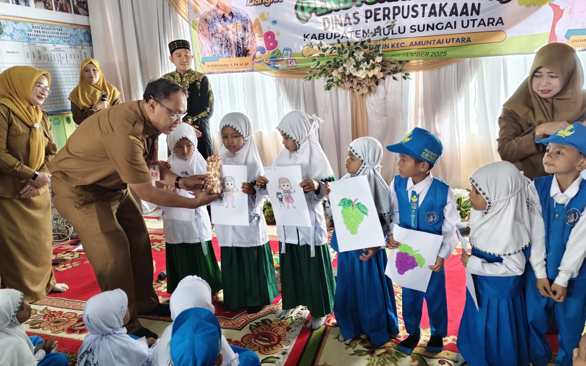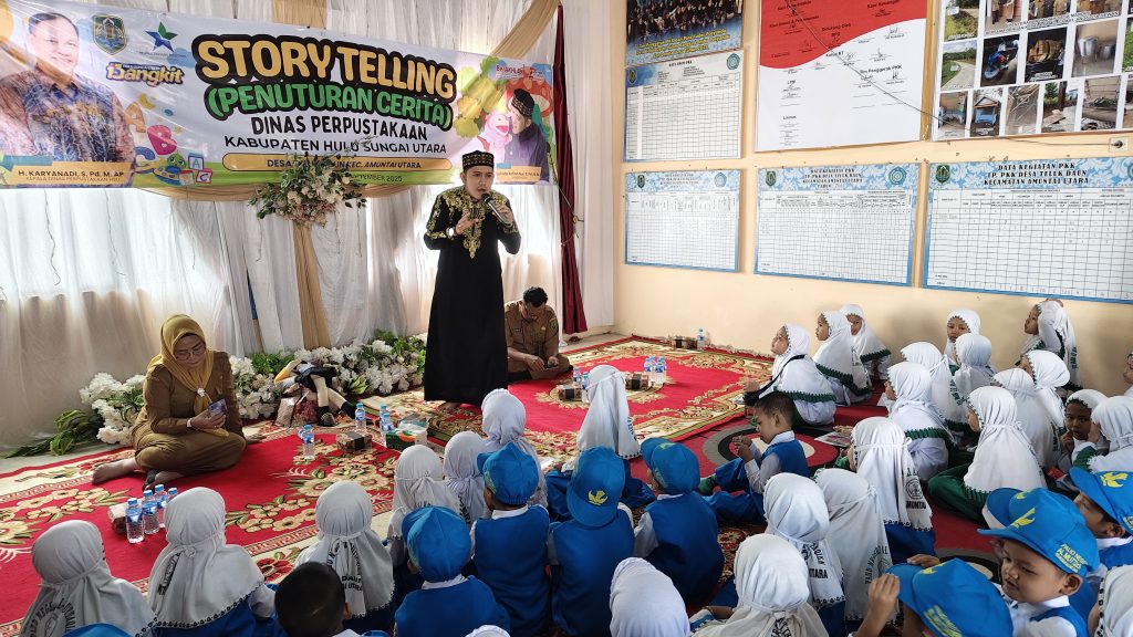 AMUNTAI – Dinas Perpustakaan Kabupaten Hulu Sungai Utara (HSU) menggelar kegiatan story telling atau penuturan cerita di Kantor Desa Teluk Daun, Kecamatan Amuntai Utara, Senin (1/9/2025).