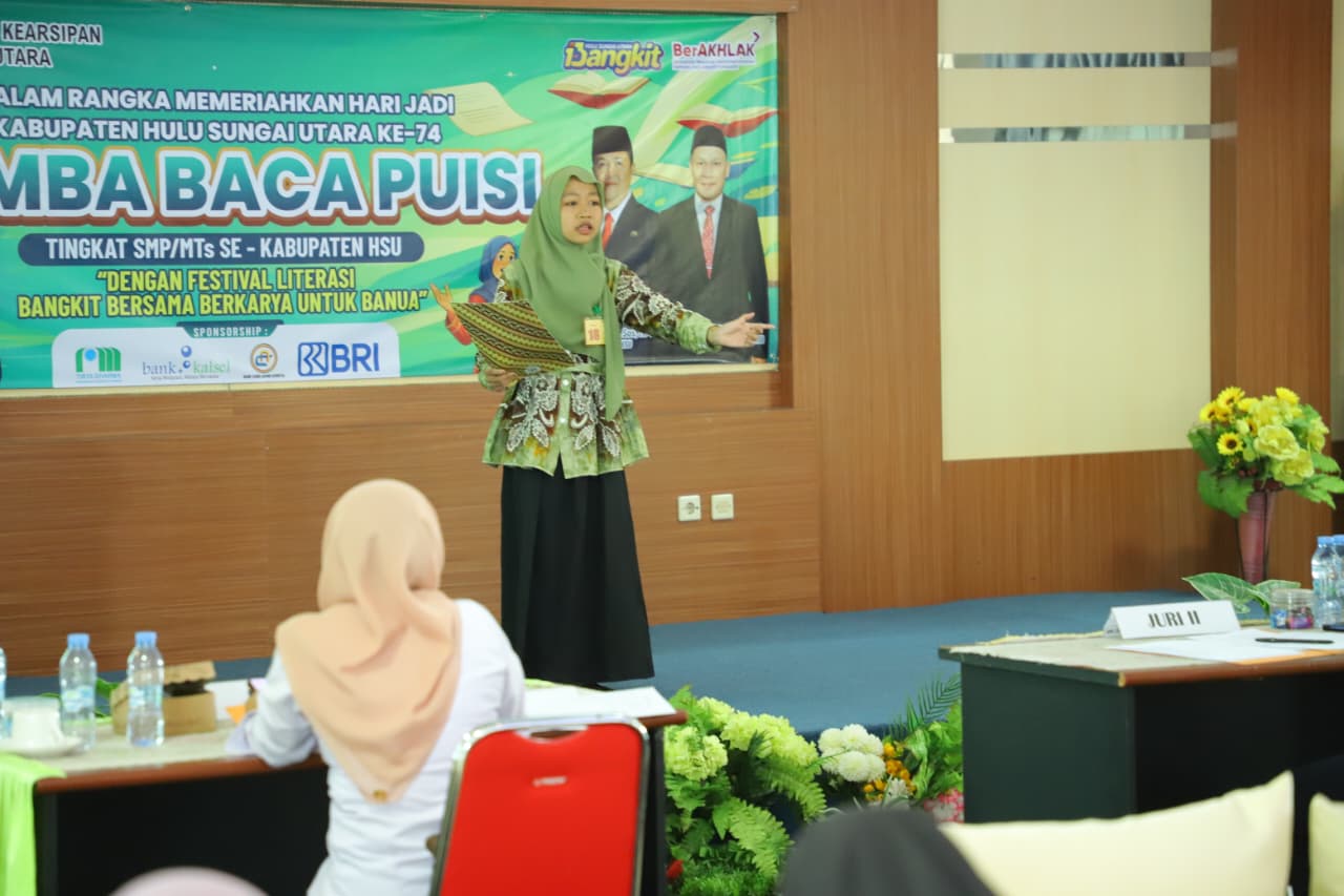 ‎AMUNTAI – Dalam upaya meningkatkan literasi di kalangan generasi muda, Dinas Perpustakaan dan Kearsipan (Dispersip) Kabupaten Hulu Sungai Utara (HSU) menggelar kegiatan Lomba Baca Puisi tingkat SLTP/Sederajat se-Kabupaten HSU, Rabu (15/4/2026).