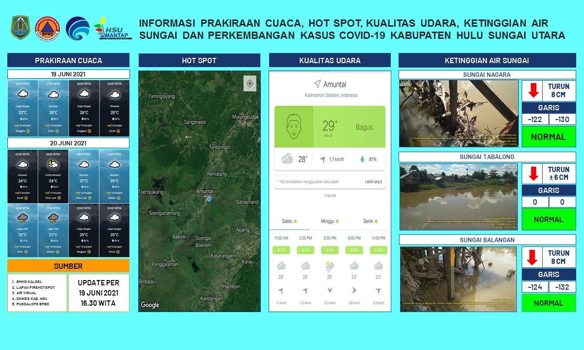 AMUNTAI – Update informasi prakiraan cuaca, hot spot, kualitas udara, ketinggian air sungai dan kasus Covid-19 Kabupaten Hulu Sungai Utara per tanggal 19 Juni 2021 pukul 16.30 WITA.