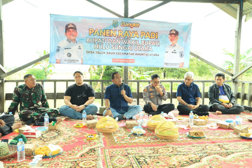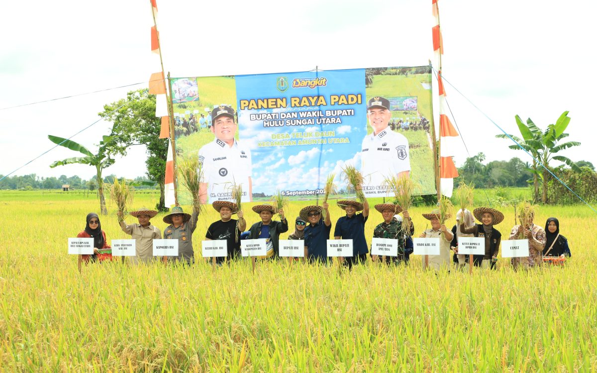 AMUNTAI – Bupati dan Wakil Bupati Hulu Sungai Utara (HSU) H. Sahrujani dan Hero Setiawan, bersama Forkopimda (Forum Koordinasi Pimpinan Daerah) melaksanakan panen raya padi di lahan pertanian, Desa Teluk Daun, Kecamatan Amuntai Utara, Senin (6/9/2025) siang.