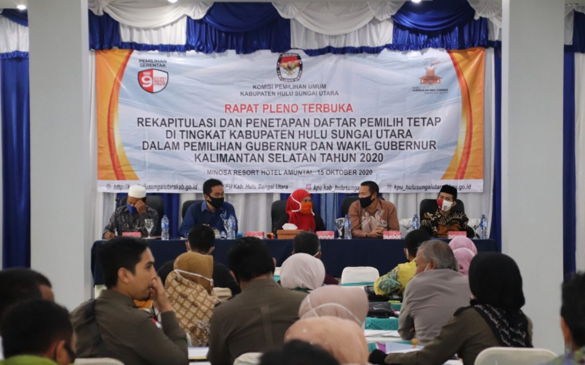 AMUNTAI – Komisi Pemilihan Umum Kabupaten Hulu Sungai Utara melaksanakan Rapat Pleno Terbuka Rekapitulasi dan Penetapan Daftar Pemilih Tetap di Tingkat Kabupaten Hulu Sungai Utara dalam Pemilihan Gubernur dan Wakil Gubernur Kalimantan Selatan tahun 2020, Kamis (15/10).