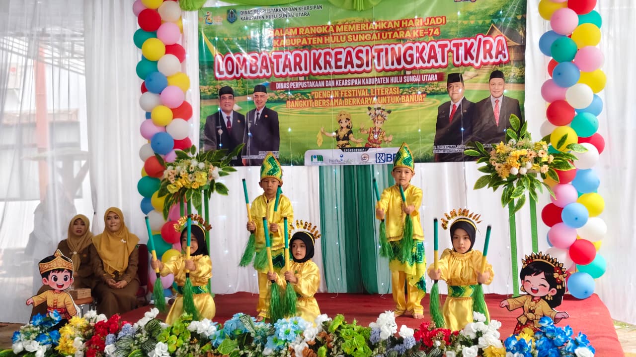 HULU SUNGAI UTARA – Dinas Perpustakaan dan Kearsipan Kabupaten Hulu Sungai Utara (HSU) menggelar lomba tari kreasi tingkat TK/RA se-HSU dalam rangka Festival Literasi dengan tema “Dengan Festival Literasi Bangkit Bersama Berkarya untuk Banua”.