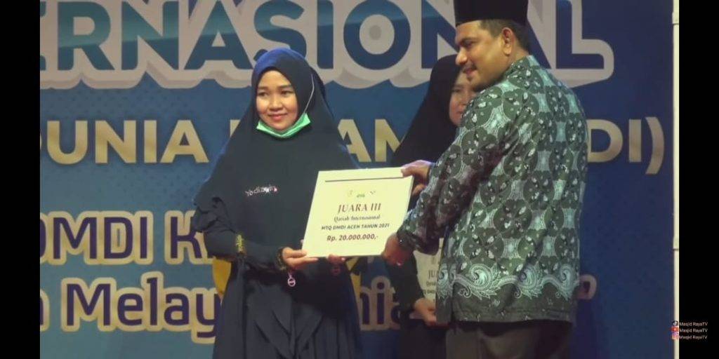 ACEH – Nida Khairiyah, wakil Kalimantan Selatan asal Hulu Sungai Utara (HSU) berhasil meraih peringkat ketiga Musabaqah Tilawatil Quran (MTQ) Internasional Dunia Melayu Dunia Islam (DMDI) yang digelar di Mesjid Raya Baiturrahman di Banda Aceh, Rabu (15/12/2021) lalu.