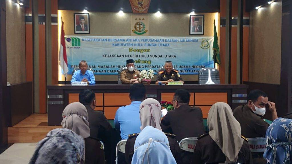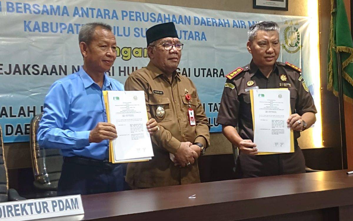 Penandatanganan ini dituangkan melalui nota kesepahaman bersama yang dilakukan oleh Kepala Kejaksaan Negeri HSU Agustiawan Umar dan Direktur PDAM HSU Fikri Anshari disaksikan langsung oleh Plt Bupati HSU Husairi Abdi di Aula Kejari HSU, Selasa (24/5/2022).