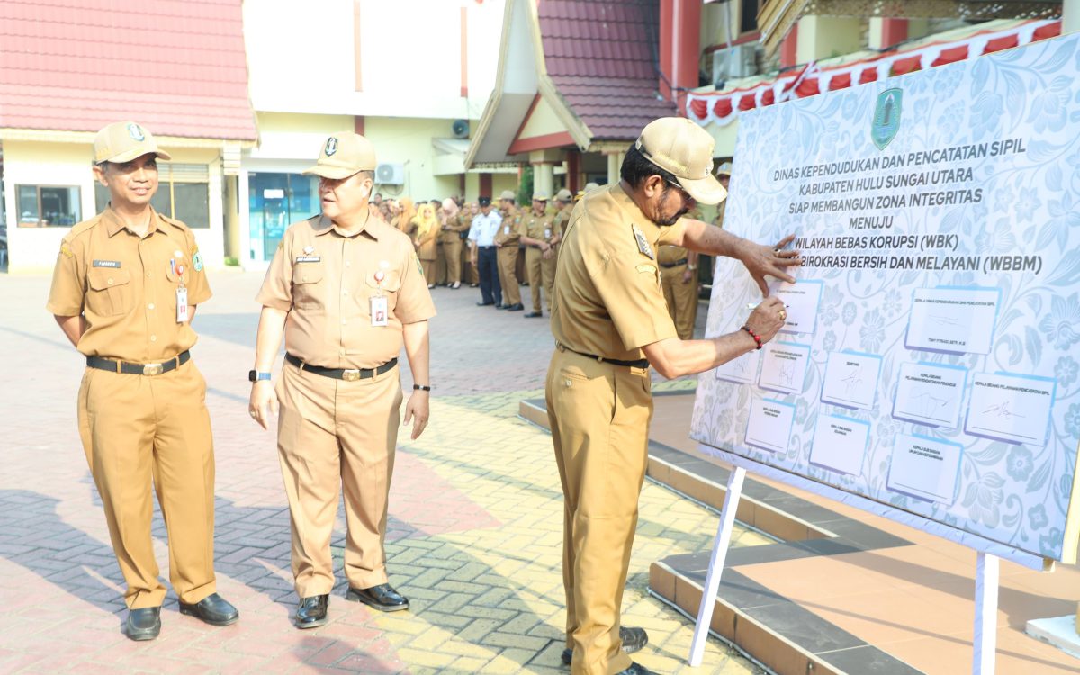 AMUNTAI – Sebagai bentuk Komitmen bersama dalam Pembangunan Zona Integritas menuju Wilayah Bebas Korupsi (WBK) serta Wilayah Birokrasi Bersih dan Melayani (WBBM) di Lingkungan Pemerintah Kabupaten (Pemkab) Hulu Sungai Utara (HSU), Penjabat (Pj) Bupati HSU Zakly Asswan melaksanakan kegiatan Penandatanganan Komitmen Bersama.