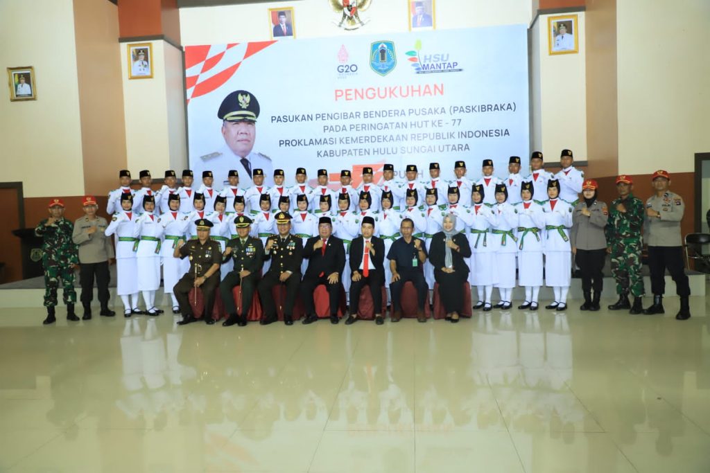 AMUNTAI – Pelaksana Tugas (Plt) Bupati Hulu Sungai Utara (HSU), Husairi Abdi mengukuhkan Pasukan Pengibar Bendera Pusaka (Paskibraka) Kabupaten HSU di Aula Idham Chalid, Selasa (16/8/2022).