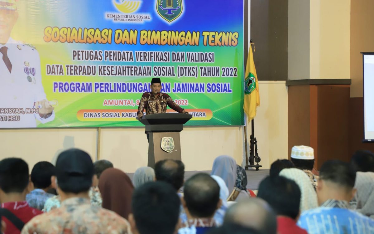 AMUNTAI – Penjabat (Pj) Bupati Hulu Sungai Utara (HSU) R Suria Fadliansyah membuka secara resmi kegiatan Sosialisasi serta Bimbingan Teknis Verifikasi dan Validasi Data Terpadu Kesejahteraan Sosial (Verval DTKS) bagi petugas pendata desa tahun 2022.