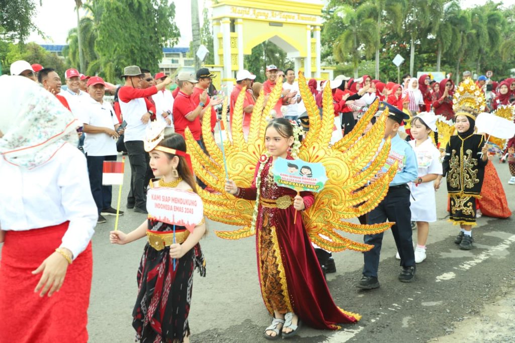 AMUNTAI – Peringatan Hari Anak Nasional di tingkat Kabupaten Hulu Sungai Utara (HSU) diramaikan dengan pawai karnaval yang meriah, Ratusan anak-anak dari tingkat Taman Kanak-kanak (TK) dan Sekolah Dasar (SD)/sederajat berkumpul untuk menampilkan kreativitas dan bakat mereka dalam acara yang penuh warna dan keceriaan ini.