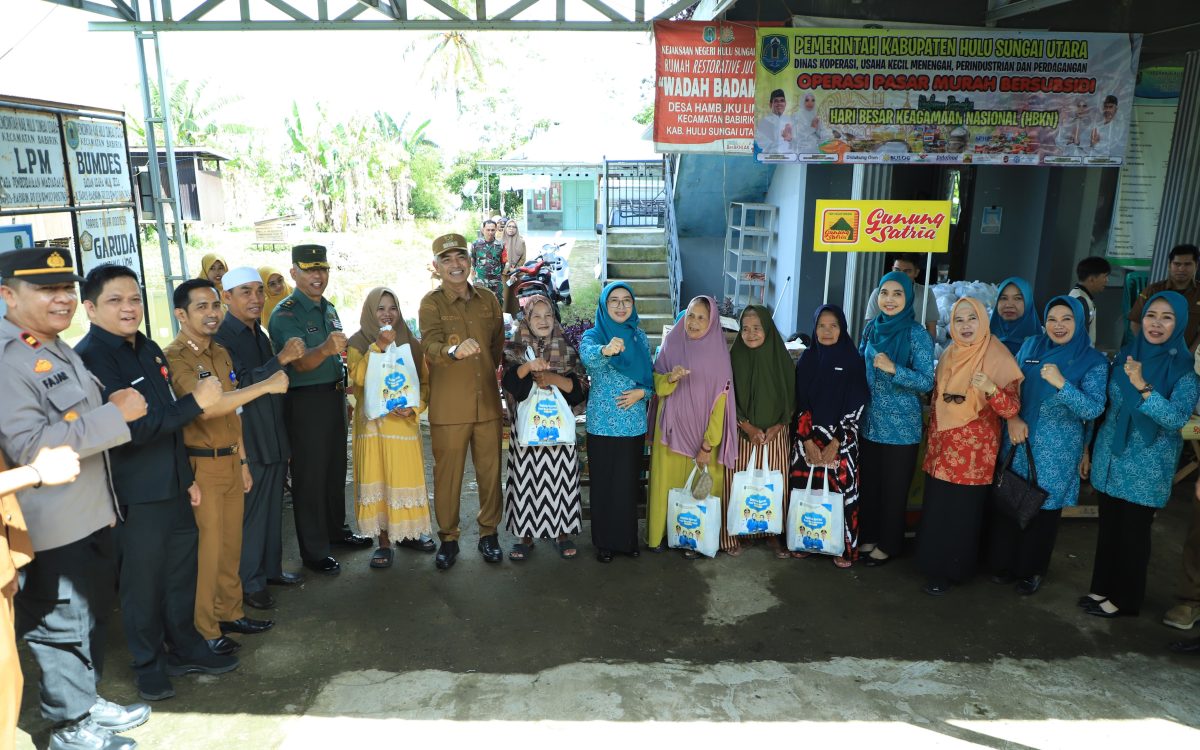 AMUNTAI – Wakil Bupati (Wabup) Hulu Sungai Utara (HSU) Hero Setiawan memantau secara langsung pelaksanaan Operasi Pasar Murah yang di gelar Dinas Koperasi, Usaha Kecil Menengah, Perindustrian dan Perdagangan (Diskuperindag) HSU, bertempat di Halaman Desa Hambuku Lima, Senin (24/3/2025).