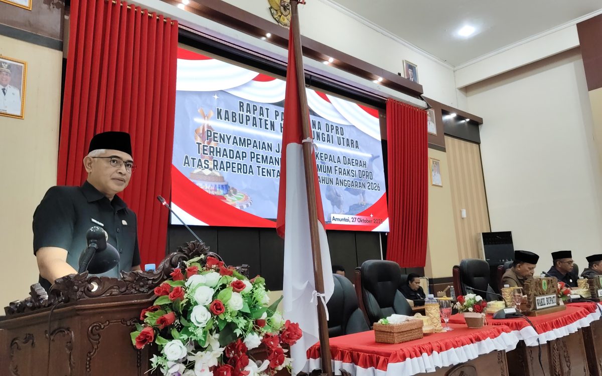 AMUNTAI — Wakil Bupati Hulu Sungai Utara (HSU), Hero Setiawan, menyampaikan jawaban resmi Pemerintah Daerah atas pandangan umum fraksi-fraksi DPRD terhadap Rancangan Peraturan Daerah tentang Anggaran Pendapatan dan Belanja Daerah (APBD) Tahun Anggaran 2026, dalam rapat paripurna yang digelar di Aula DPRD HSU, Senin (27/10/2025).